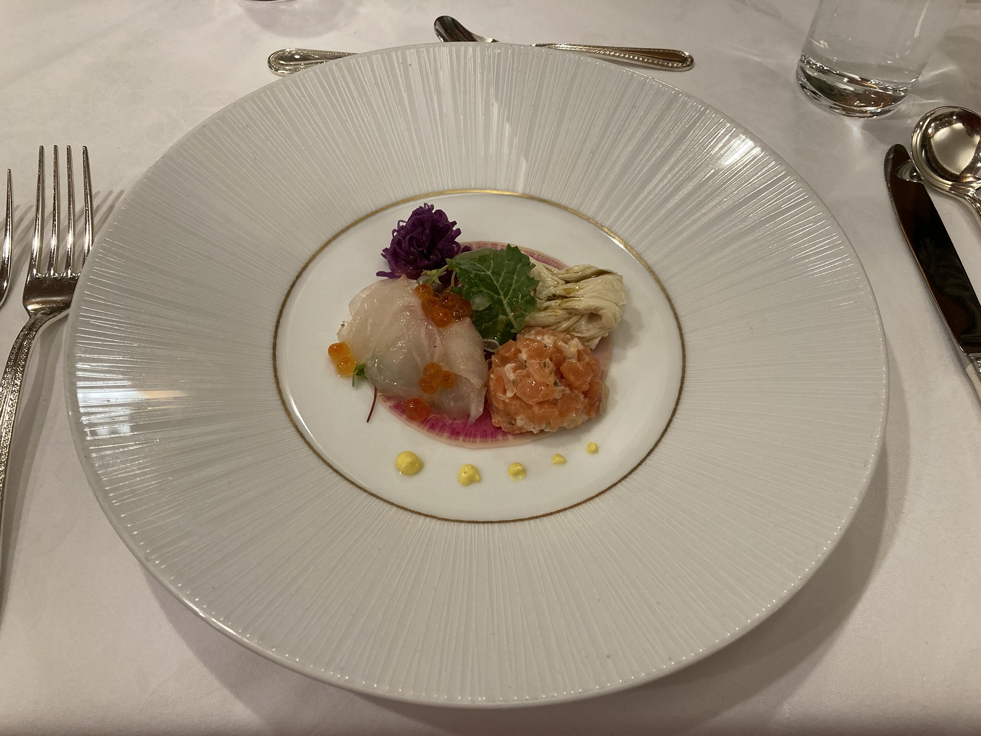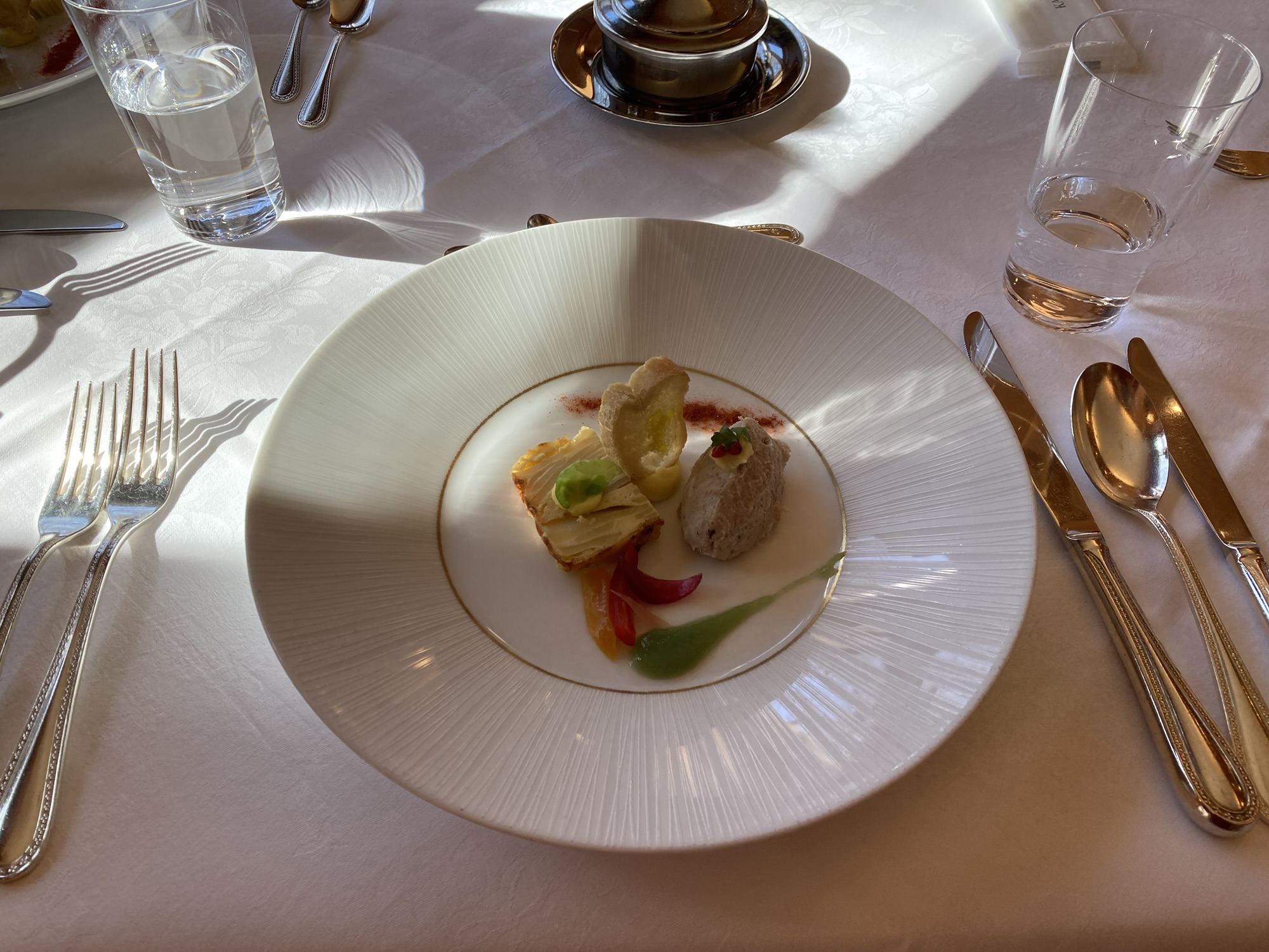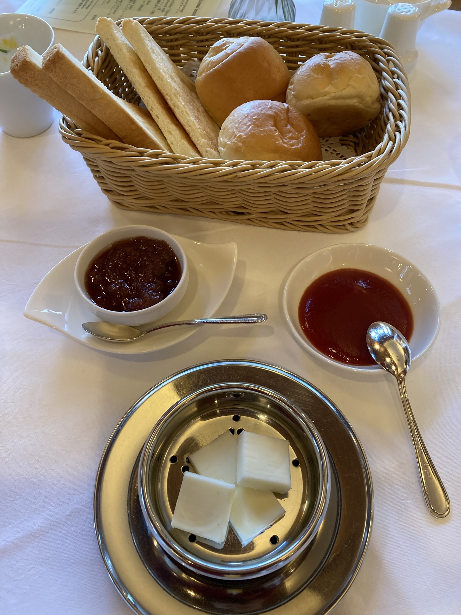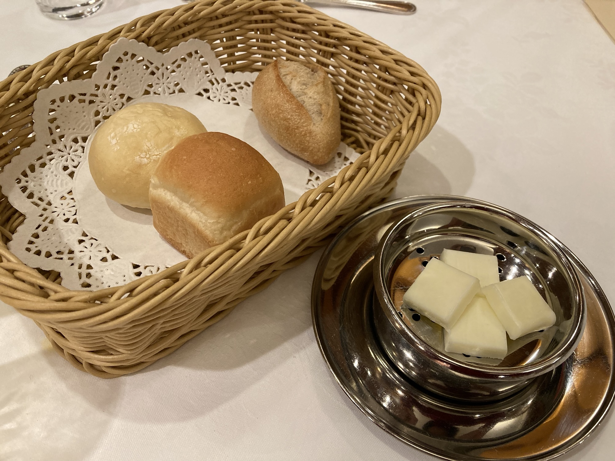 鯛、ヤシオマスのタルタル、湯葉のオードブル。パンは金谷ホテルベーカリーのもので、 バターも特製。おかわり自由で食べ過ぎてしまいました。