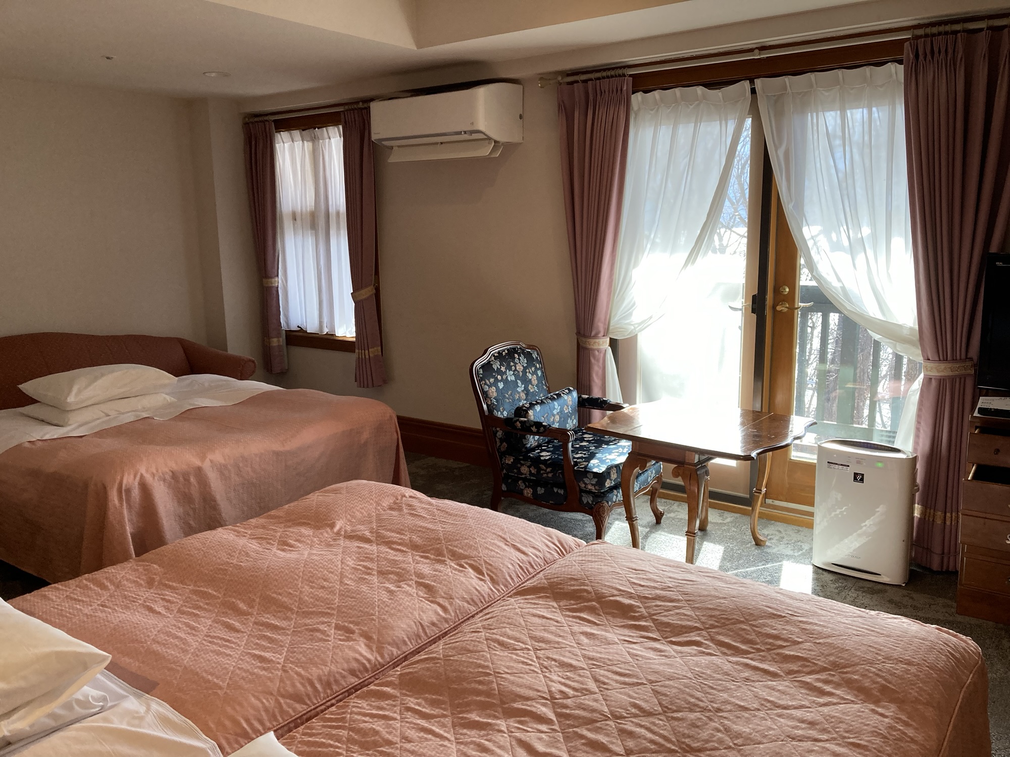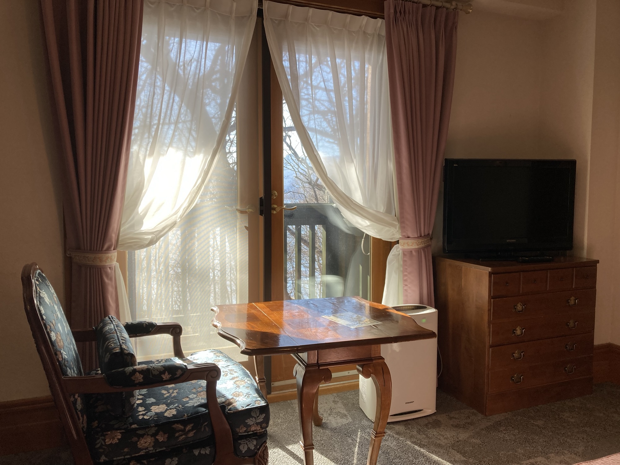 大きなバルコニーのある室内には、テーブル&チェア、テレビ、そして加湿空気清浄機。