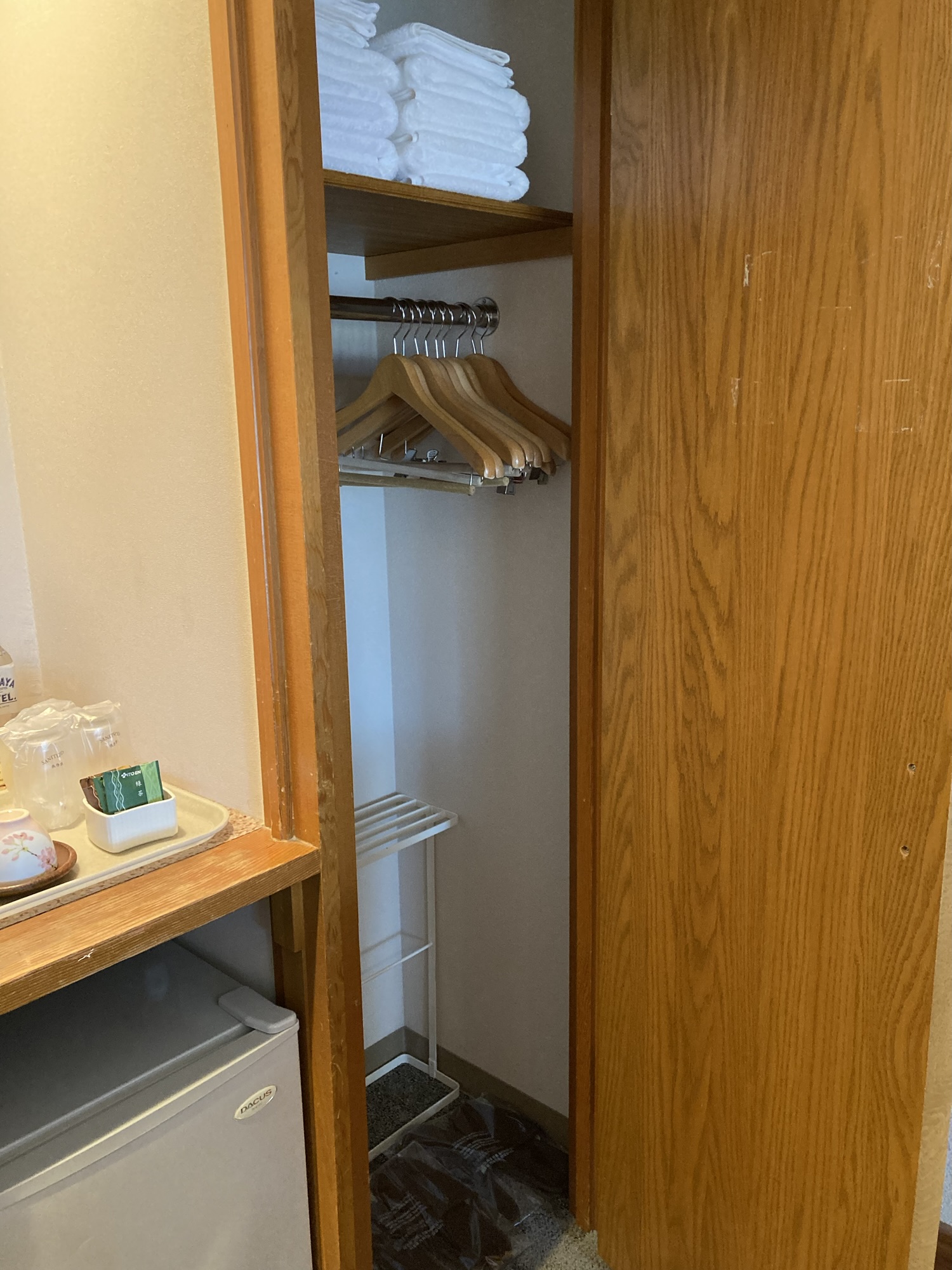 クローゼットの上にはたくさんのタオル。温泉には部屋からタオルを持って行く必要がありますが、毎回取り替えても問題ないくらいの量が入っていました。
