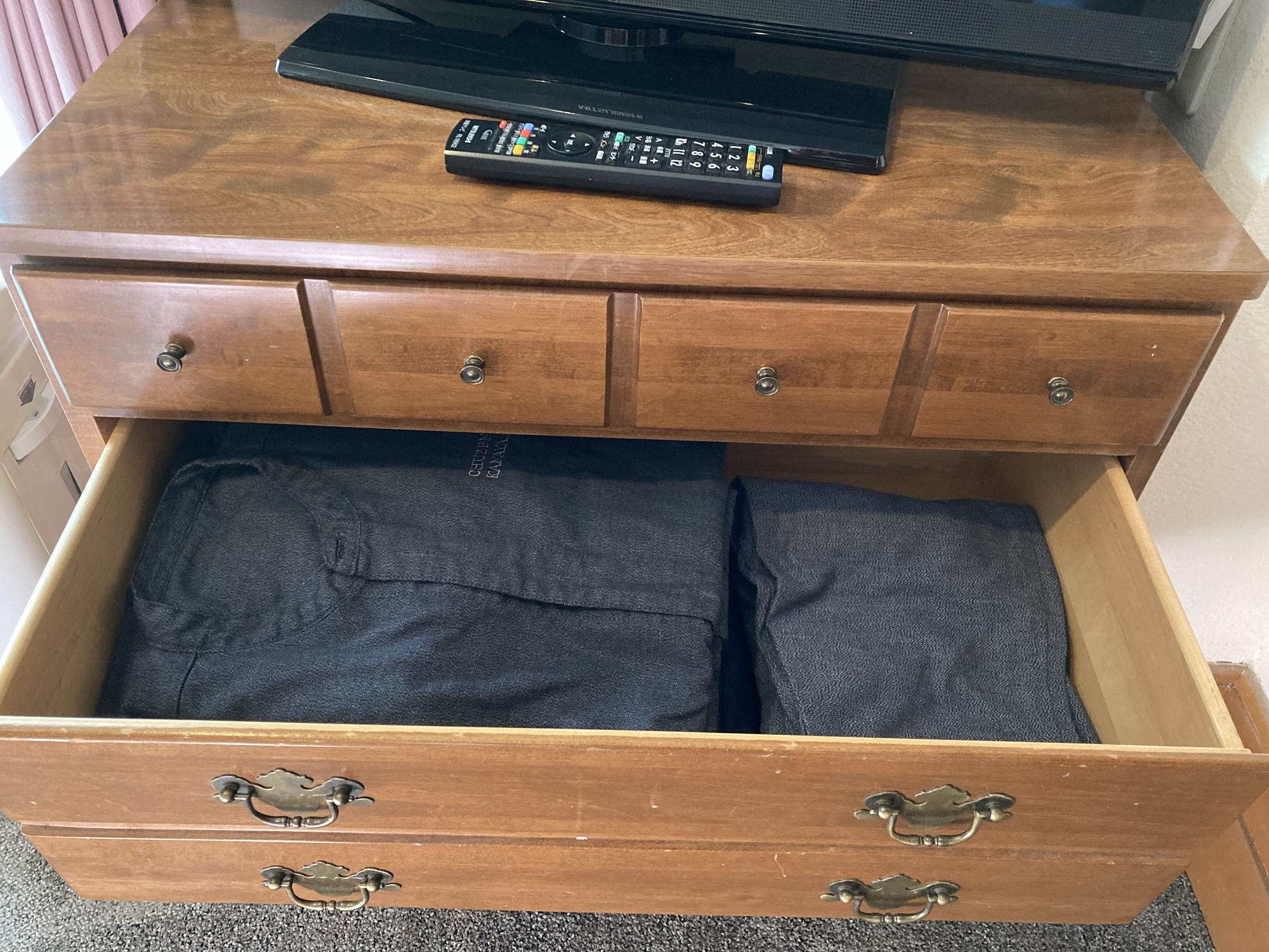 館内着は中禅寺金谷ホテル特製の着心地の良い綿のパジャマで、テレビの下の箪笥に入っています。少し前までは浴衣だったようですが、やはりパジャマが寝心地良いですね。持参しなくて良いので荷物が少なくなり助かりました。