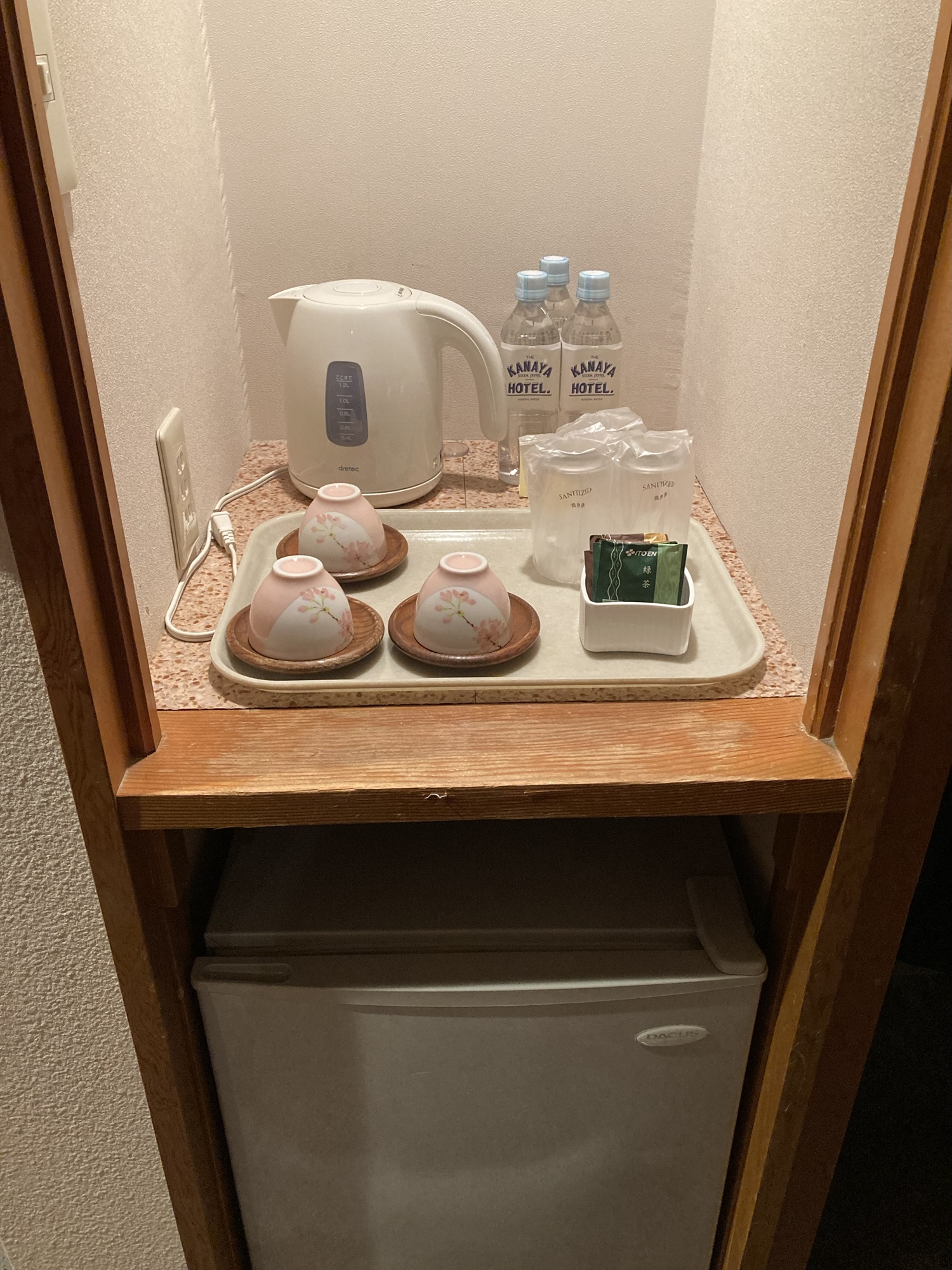 冷蔵庫(ミネラルウォーターあり)と電気ポット。