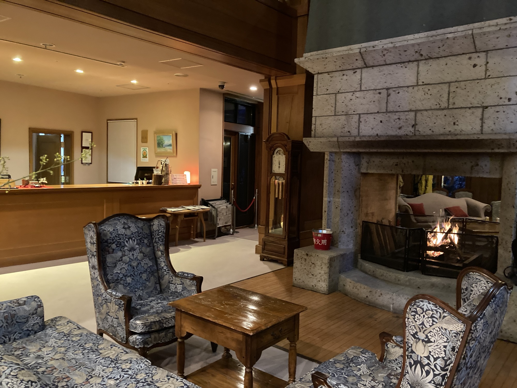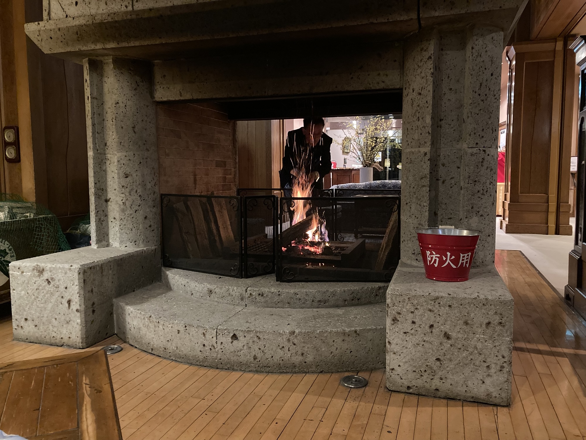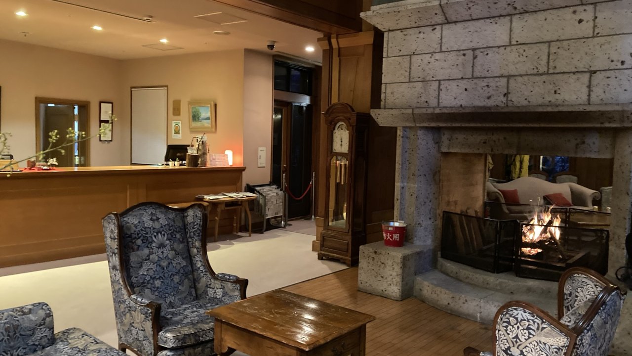 夜は暖炉に火が点ります。パチパチとした音と揺れる火を眺めるとなんだか癒されます。スタッフさんが、たまに薪を入れに来てくれて薪を並べ替えるのを見るのも楽しい。