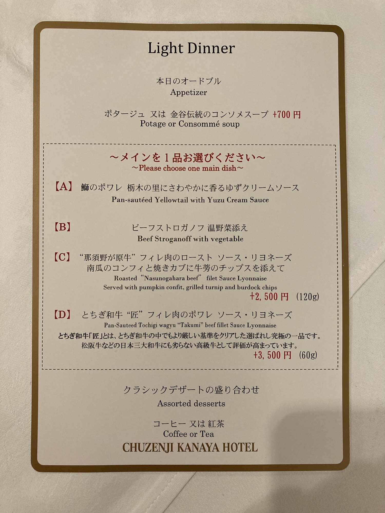 メインダイニングでのライトディナー、