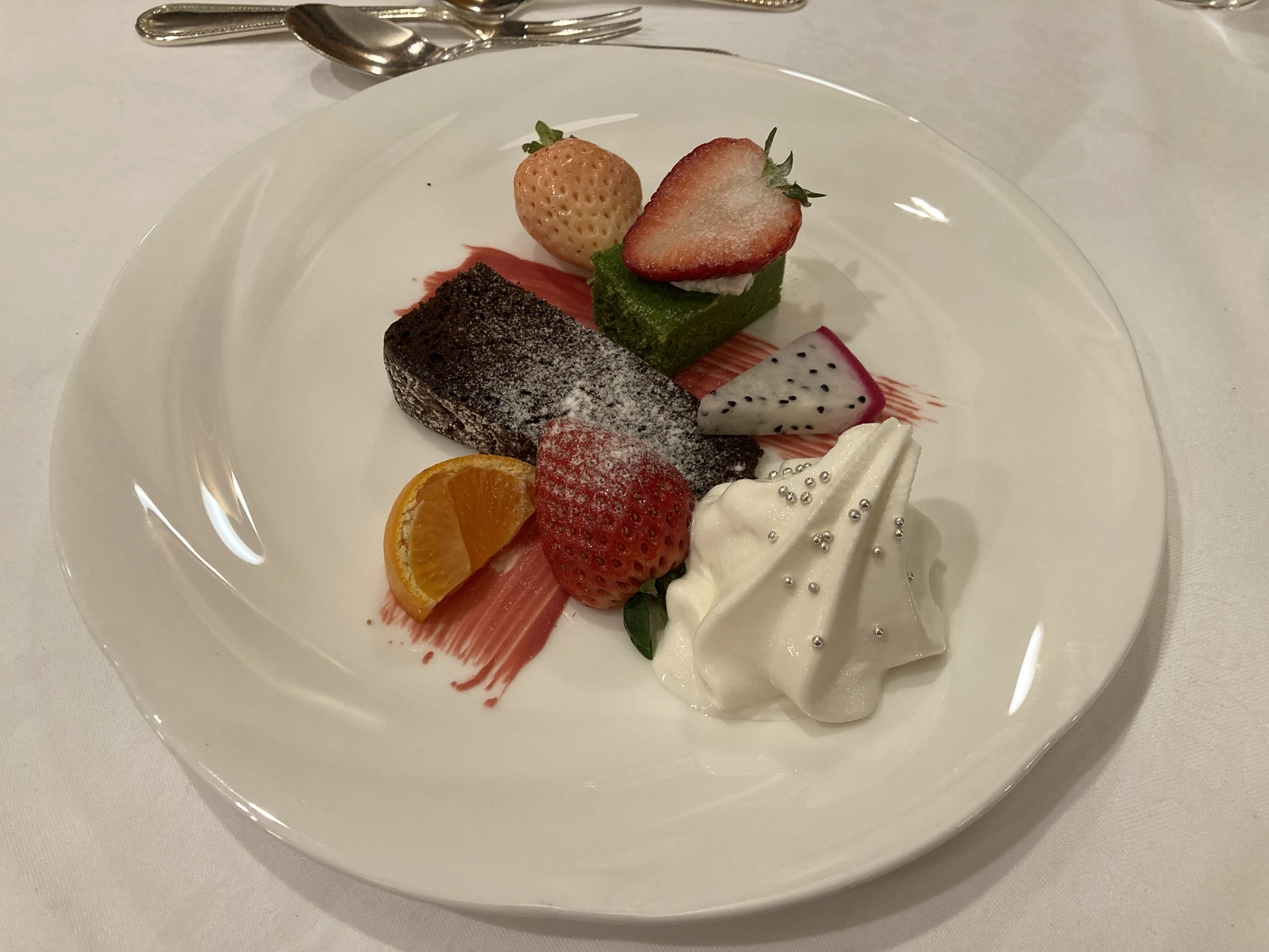 デザートはガトーショコラ、抹茶のテリーヌ、栃木のいちご(とちおとめ、ミルキーベリー)。