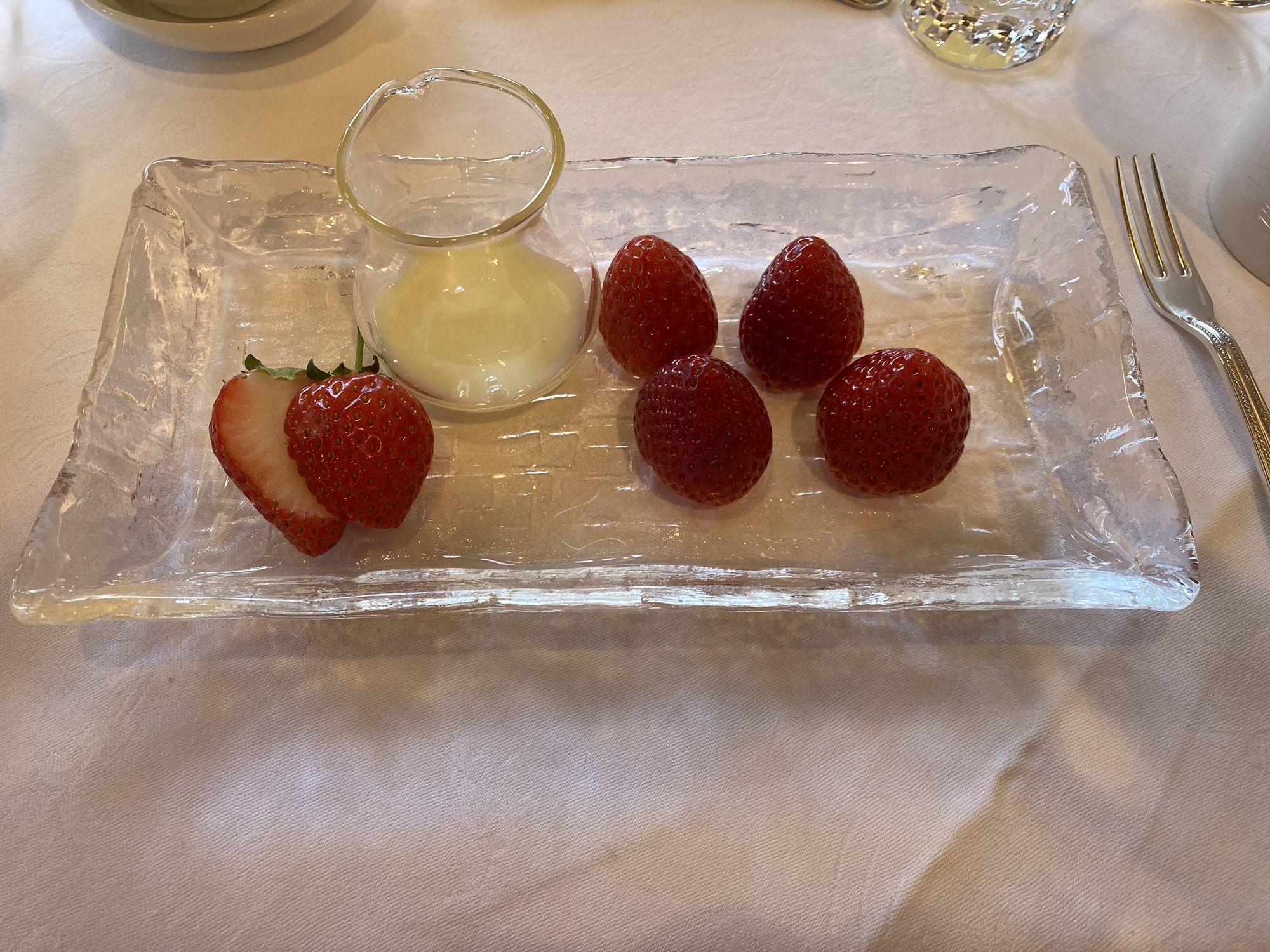 追加でデザートにとちあいかの練乳がけを。デパートに出されるような高級なグレードだそうで、味が濃く甘くて形が良いものばかりでした。