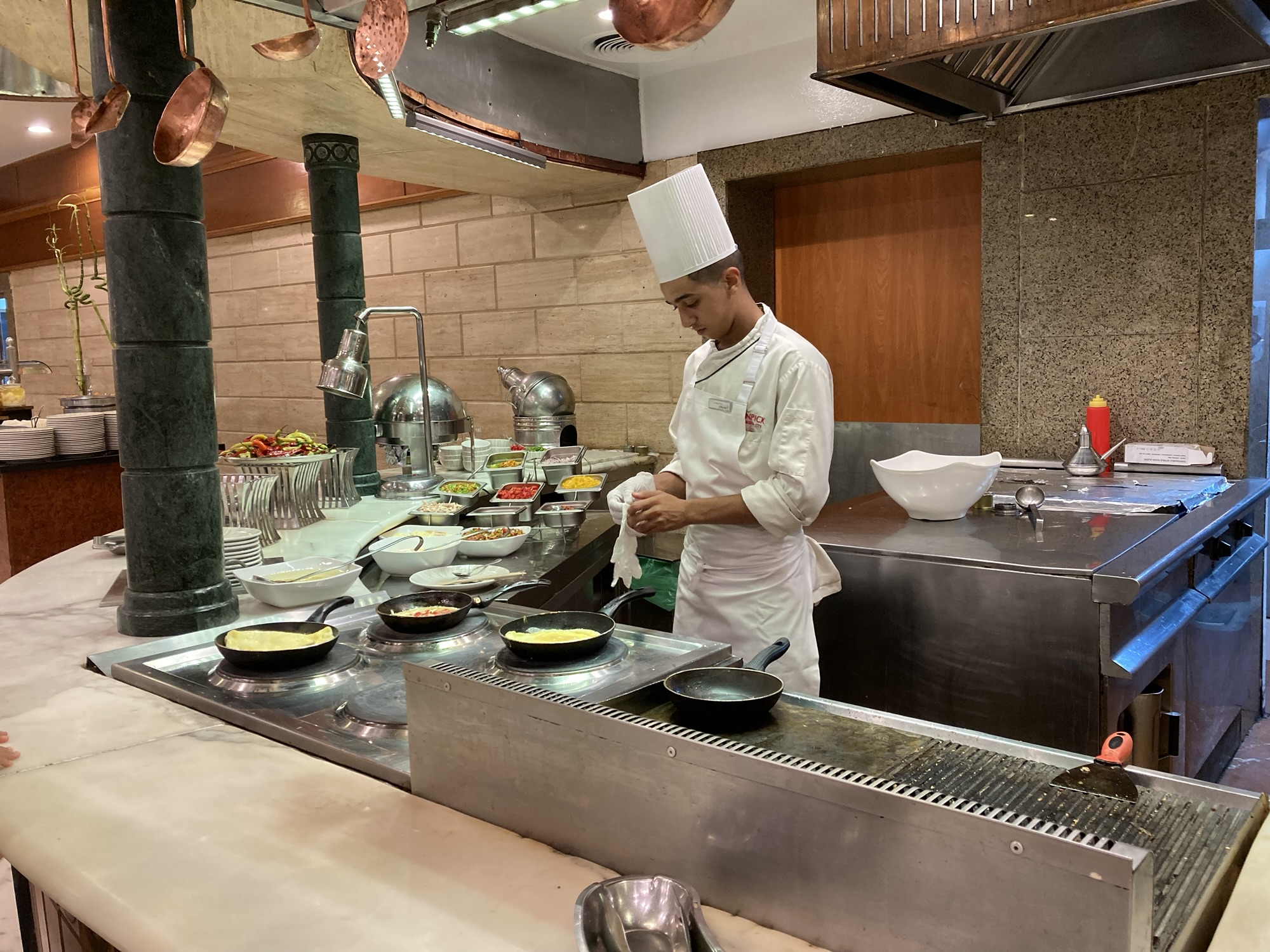 その場で焼いてもらえるオムレツコーナー、クロワッサンやパンケーキ、フルーツ、ヨーグルト、サラダバー、温野菜やチキンソーセージなど。